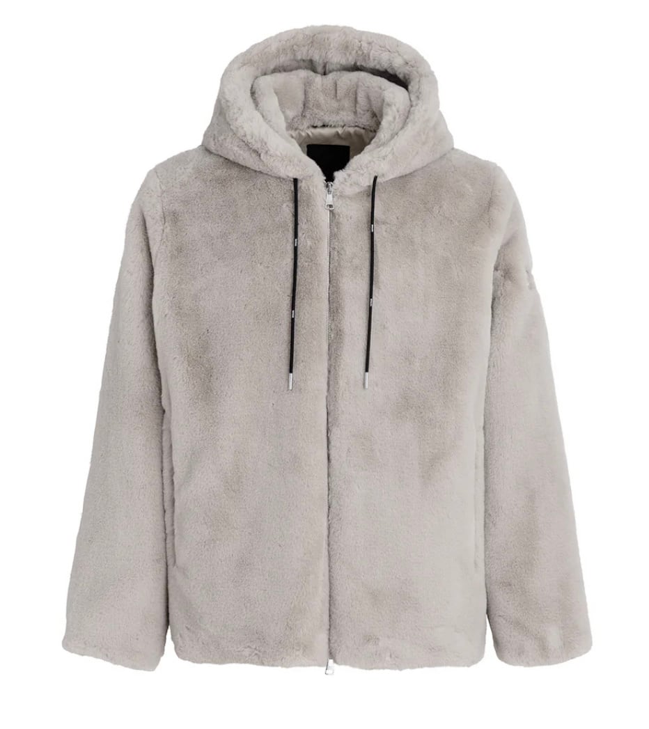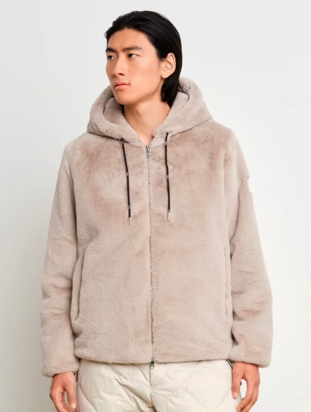 美しい艶感を持つ、エコファー素材を採用したフード付きブルゾン。